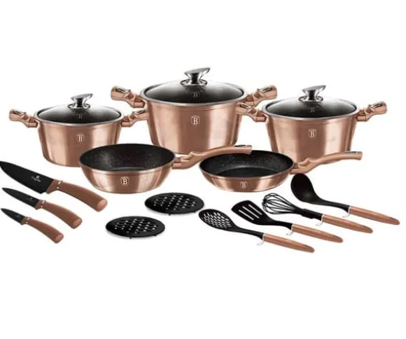 BERLINGER HAUS BH-6161 ROSE GOLD METALLIC LINE GRANIT KOKSÄTT, 17 DELAR Krukor och tillbehör från METALLIC-serien från BERLINGERHAUS är gjorda av högkvalitativt smidd aluminium täckt inuti med en trippel granitbeläggning (marmor) med en mycket hög hårdhetskoefficient. Ytterbeläggningen finns i flera färgversioner med en karakteristisk metallisk glans. Dessa snygga och fashionabla rätter är utrustade med SOFT TOUCH-handtag (silikonhandtag) som standard. Lämplig för alla typer av spisar: gas, el, keramik, halogen, induktion. TURBO INDUCTION-systemet (värms upp mycket snabbt) gör att du kan spara upp till 35 % energi. I satsen ingår: Stekpanna 20 x 4,5 cm, 1,0 L långpanna 24 x 6,5 cm, 2,3 L Gryta med lock 20 x 10,4 cm, 2,5 L Gryta med lock 24 x 11,8 cm, 4,1 L Gryta med lock 28 x 12,4 cm, 2 st Skårad sked Slevvisp 3-delad knivsats: Kockkniv Universalkniv Skalkniv Egenskaper: Trippel non-stick granitbeläggning Material: högkvalitativt gjutet aluminium Soft-Touch Handtag: silikonhandtag TURBO INDUKTIONssystem (värms upp mycket snabbt) 35 % energibesparing Diskmaskinssäker induktion, elektrisk, spis, gas, spis, spis Färg: KOPPAR Granitbeläggning är en teflonbeläggning berikad med granitpartiklar, vilket ger den större hårdhet. Det är hårdare än teflon, men behåller sina fördelar: det brinner inte och fördelar värmen bra. Kombinerar fördelarna med kokkärl i gjutjärn och teflon. Den har alla fördelar med teflon, men är mer motståndskraftig mot skador och överträffar till och med keramiska beläggningar. Granitbeläggningen gör disken exceptionellt reptålig och hållbar. Denna typ av grytor och stekpannor tillåter också stekning med en minimal mängd fett, eftersom kärlet värms upp på samma sätt som en sten och avger värme över hela ytan. Sammansättningen av aluminiumkroppen och den ferromagnetiska botten möjliggör användning på induktionsspisar och alla andra typer av spisar och användning av de bästa acktermiska egenskaperna hos gjutet och smidd aluminium på alla spisar och spisar.