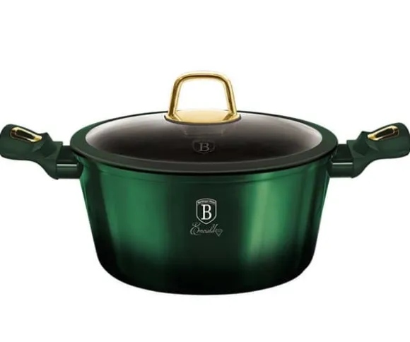 BERLINGER HAUS EMERALD GRYCKER OCH PANOR SET. Köksredskap ingår. Grytor, kastruller och tillbehör från EMERALD METALLIC LINE-serien från BERLINGE RHAUS är tillverkade av högkvalitativt smidd aluminium belagd inuti med en titanbeläggning med en mycket hög hårdhetskoefficient. Den yttre beläggningen är grön med en karakteristisk metallisk glans. Dessa snygga och fashionabla rätter är utrustade med SOFT TOUCH-handtag (silikonhandtag) som standard. Lämplig för alla typer av spisar: gas, el, keramik, halogen, induktion. TURBO INDUCTION-systemet (värms upp mycket snabbt) gör att du kan spara upp till 35 % energi. Setet innehåller: gryta med lock, diameter 24 cm, höjd 11,8 cm, kapacitet. 4,1 liter, gryta med lock, diameter 20 cm, höjd 10,4 cm, kapacitet 2,5 liter, stekpanna 24 cm i diameter, höjd 4,8 cm, Stekpanna 20 cm i diameter, höjd 4,5 cm, hålslev, köksspatel, slev, visp Egenskaper: Trippel non-stick granitbeläggning Material: högkvalitativt gjutet aluminium Soft-Touch Handtag: silikonhandtag Glaslocks-system INDUCTION 3 mycket snabbt uppåt ving Tål att diskas i maskin För alla typer av spisar: gas, elektrisk, keramik, halogen, induktion Färg: grön Redskap av högtemperaturbeständig termoplastisk nylon Hållbar kokkärl i gjuten aluminium gör att du kan laga mat utan att fastna och med en liten mängd fett. Titanskiktet gör kastrullerna extremt reptåliga. Du kan förbereda läckra och hälsosamma rätter i dem som inte förlorar sin saftighet och näringsvärde. Lämplig för alla typer av spisar: gas, el, keramik, halogen och induktion.