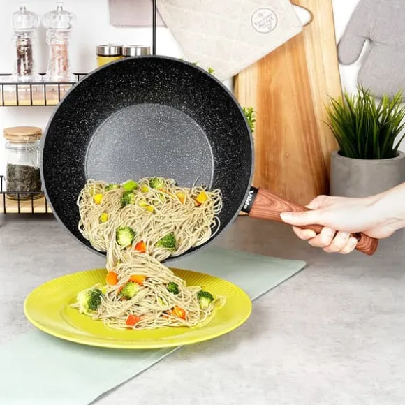 En wokpanna med non-stick-beläggning och unik, tidlös design. Stekpannan har en trendig kombination av svart och trä, vilket gör den till ett slående tillskott i alla kök. Denna kastrull är oumbärlig i varje kök. Den är perfekt för att steka kött, grönsaker och asiatiskt inspirerade rätter. Perfekt för att tillaga pasta. Tillverkad av material av högsta kvalitet. Vid korrekt användning kommer den att hålla i åratal. Den ser imponerande ut i köket och när man serverar rätter direkt på bordet. Original Vilde-produkt från Black&Wood-serien. Tillverkad i enlighet med europeiska standarder.