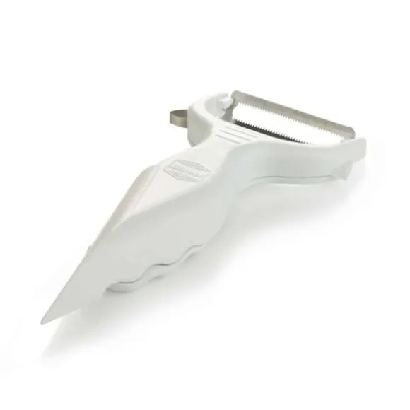 Med den ursprungliga Boerner garneringsskalaren kan du skala, dekorera, skära ut, riva och garnera. Det är sex funktioner i en enhet! Ett praktiskt rivjärn är integrerat på baksidan, med vilket vitlök eller ingefära kan rivas fint. Materialet som ska rivas faller direkt in i handtagskroppen och fångas upp helt. Ditt kök förblir rent. Den multifunktionella skalaren möjliggör särskilt effektiv peeling i båda riktningarna. Rengör helt enkelt under rinnande vatten efter användning. Produktdata: högkvalitativt blad av rostfritt stål livsmedelssäkra material robust rivjärn för ingefära, vitlök och muskot garnier öga och skärare precisionsfräsar praktisk citrusöppnare funktionell form lätt att använda och rengöra lämplig för vänster- och högerhänta fri från mjukgörare och BPA i färgerna: röd, Orange, grön, violett och vit
