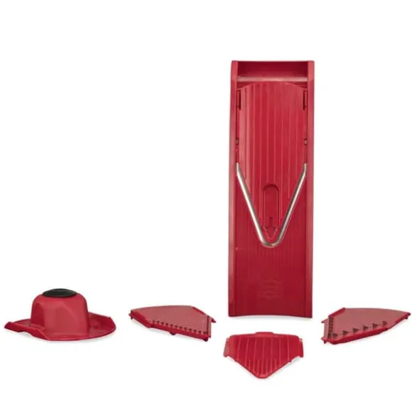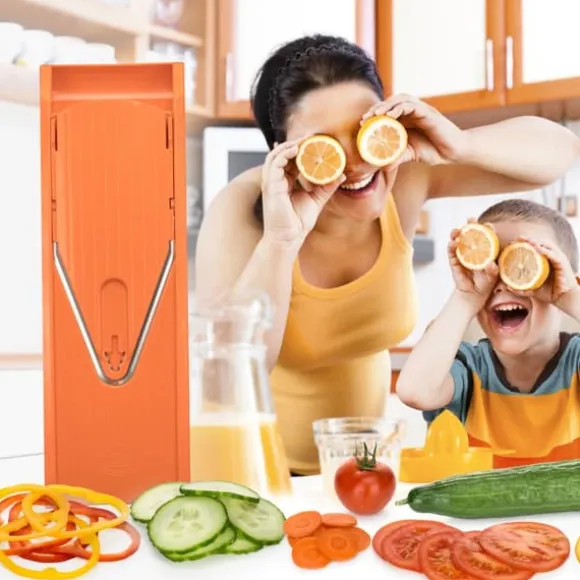 - Leverans omfattning: Startsetet består av en justerbar grönsaksskärare, en praktisk säkerhetsinsats, samt två insatser med blad som underlättar att skära julienne-remsor och en säkerhetsfrukthållare.