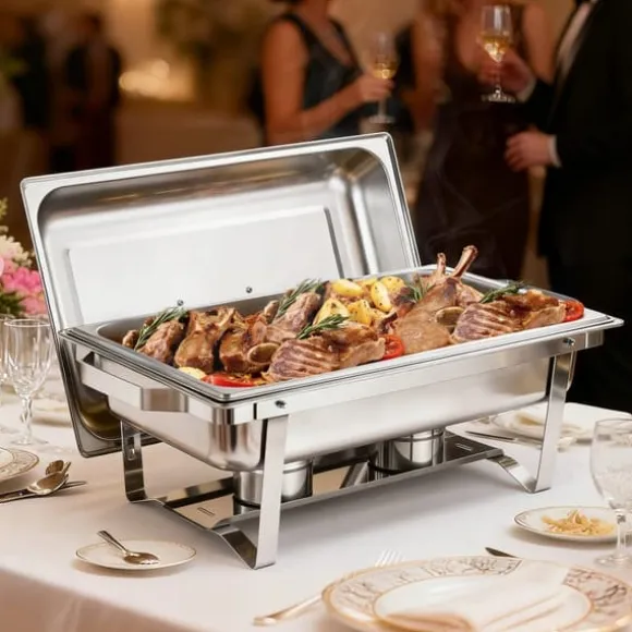 Elegant chafing set i rostfritt stål för professionell serveringDetta 9-liters chafingset i livsmedelsklassat SS201 rostfritt stål kombinerar hållbarhet med en spegelblank finish som lyfter varje buffé. Det håller effektivt både varma och kalla rätter och är perfekt för större tillställningar, catering och självservering.
