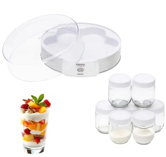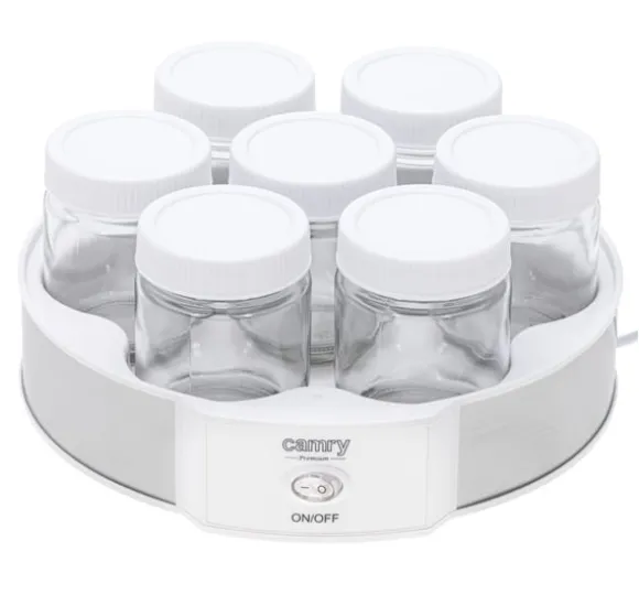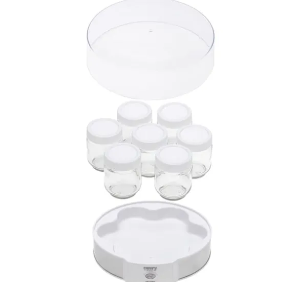 Övriga funktioner: 7 praktiska glasburkar med skruvlock (200 ml); Belyst på/av-brytare; Genomskinligt lock