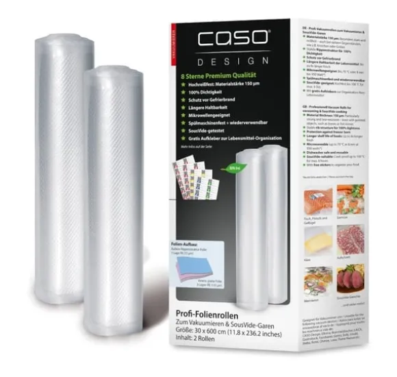 Lådans innehåll: 2 st folierullar och praktiska klistermärken för att organisera innehåll, datum och vikt (kan kombineras med CASO Food Manager-appen)