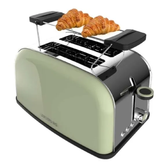 Steel toaster with double short slot, 850 W power, and warming rack. Double short slot toaster with capacity for two slices of toast. 850 W power. 3.8-cm wide slot for thick or bigger toast. Stainless-steel finish. Top rack to heat large-sized food such as pastry or croissants. Automatic power-off and pop-up mechanism. Automatically-ejected toast when the program ends. Self-centring system to achieve a even toasting on both sides. Adjustable power, 7 toast settings for perfect results. Preset functions: Reheat and defrost function. Cancel button to interrupt the toasting process. Easy-to-remove crumb tray. Toaster, warming rack, instruction manual