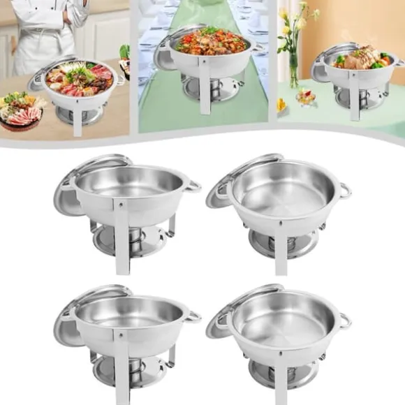 Runt värmehållningsset i rostfritt stål – Silver Servera och håll maten varm med stil. Detta moderna, minimalistiska chafing dish-set i silver passar restauranger, bufféer, hotell, caféterior, foodtrucks och privata event som bröllop och födelsedagar. Robust rostfritt stål, enkel bordsplacering och fyra kompletta enheter ger proffsigt resultat.