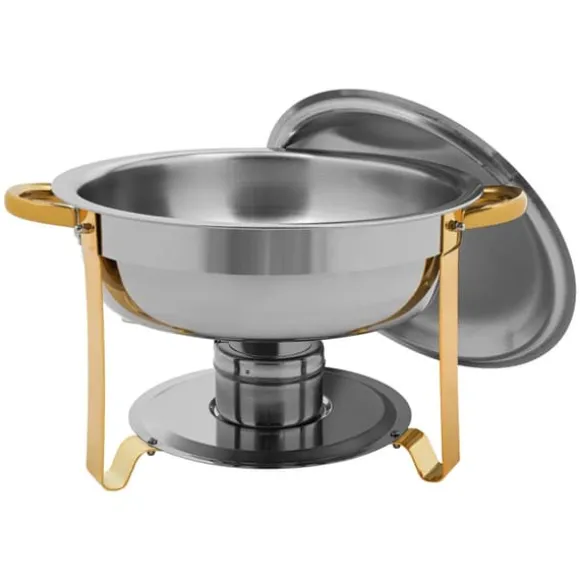 Runt chafing dish-set i guld för varmhållningDetta moderna set i rostfritt stål håller rätter varma och serverar dem med stil. Perfekt för restauranger, hotell, bufféer och festligheter – den gyllene finishen ger en elegant touch på varje bord.