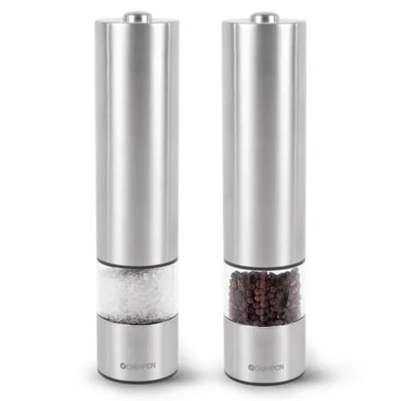 Med Champion elektriska salt & pepparkvarn är nymalda kryddor bara ett handtryck borta. Salt & pepparkvarnen är enkla att fylla på och är utrustade med en praktisk belysning i botten som startar automatiskt vid malning. Den stilrena designen passar både för köksbänken och direkt på bordet. Drivs med 4 AA-batterier.- Rostfritt hölje- Batteri: 4xAA-batterier (ingår ej)- Belysning i botten- Justerbar kvarn för fin eller grov malning- Mått BxH: 5,2×22,7cm- Vikt: 0,28kgAnvändarmanualEU-försäkranProduktblad