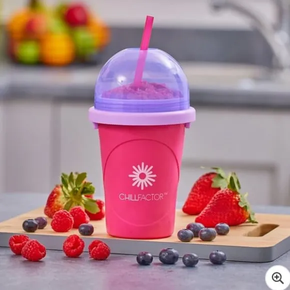 The ChillFactor Slushy Maker allows you to make delicious slushies’ in seconds! So easy to use, all you have to do is put in the freezer, wait for it to freeze then add your preferred chilled drink and squeeze. Right before your eyes you will see slushy appear in seconds! Once you have made your slushy you can use the spoon straw included to enjoy. The ChillFactor Slushy Maker is transportable so you can enjoy your slushy anywhere once made.