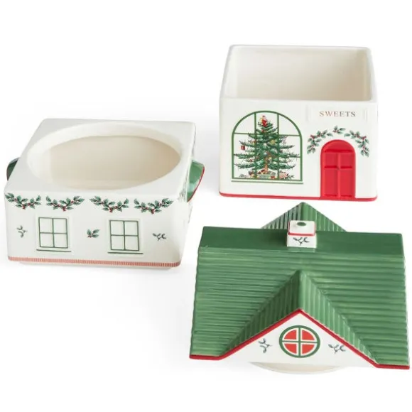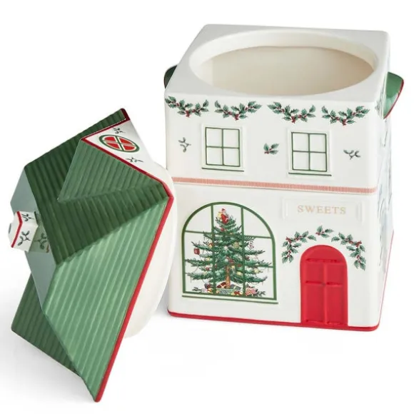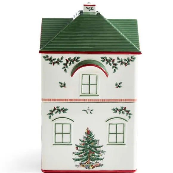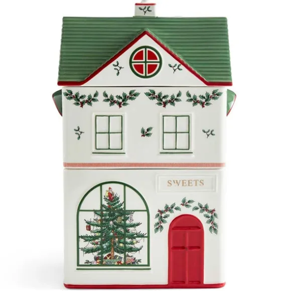 Christmas Village Kakburk, 2 Våningar, sprider julglädje i köket med sin lekfulla design. Den är tillverkad i keramik och formad som en gammaldags godisbutik med röd dörr, välvda fönster och grönt tak. Burken består av tre stapelbara delar – perfekt för att förvara julgodis, bakingredienser eller andra köksfavoriter på ett både praktiskt och dekorativt sätt.