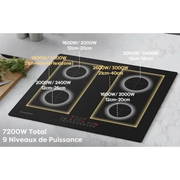4 brännare: 4 brännare kan användas ensamma eller samtidigt Snabb uppvärmning: Total effekt upp till 7200W 2 flexibla zoner: Mer utrymme, mer frihet, njut av läckra rätter Slider Touch Control: Lätt att använda, använda s