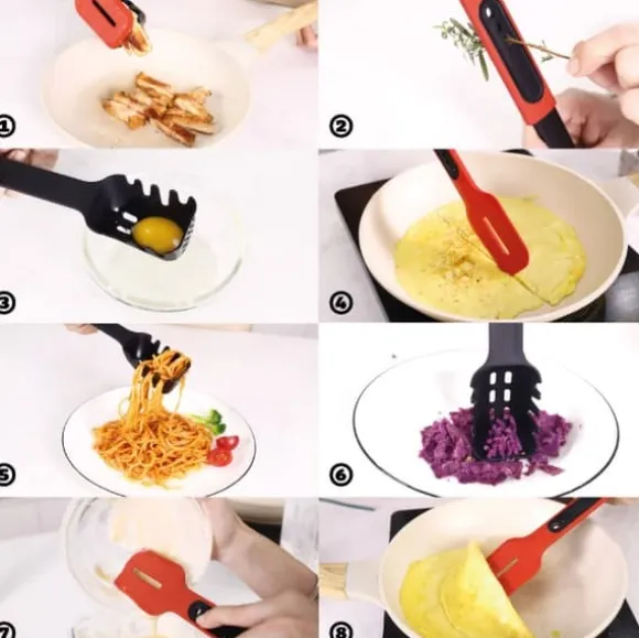 antal funktioner: 8 (tång, örtverktyg, guleseparator, kniv, pastasked, mosare, spatel, vändare)