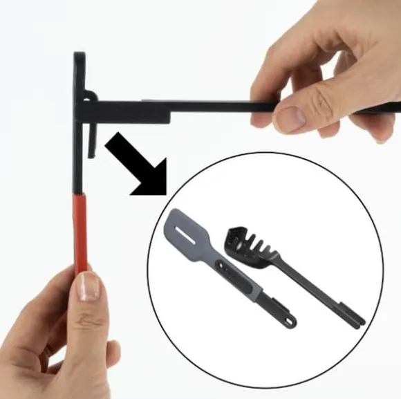 allt du behöver varje dag – från tång och kniv, via ett verktyg för att skala örter och separera gulor, till en spatel, mortelstöt, en pastasked och en vändare för att vända mat. Enheten är lätt att fälla ut och ihop