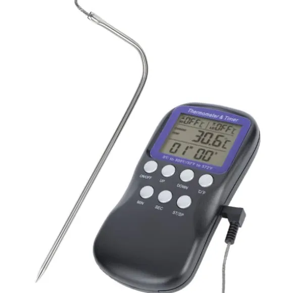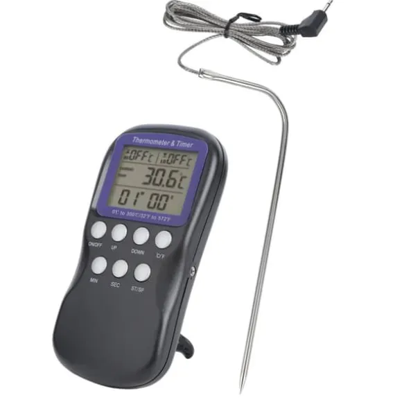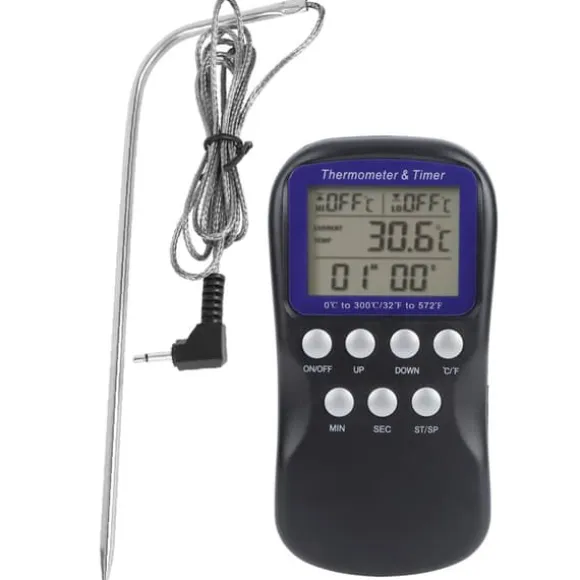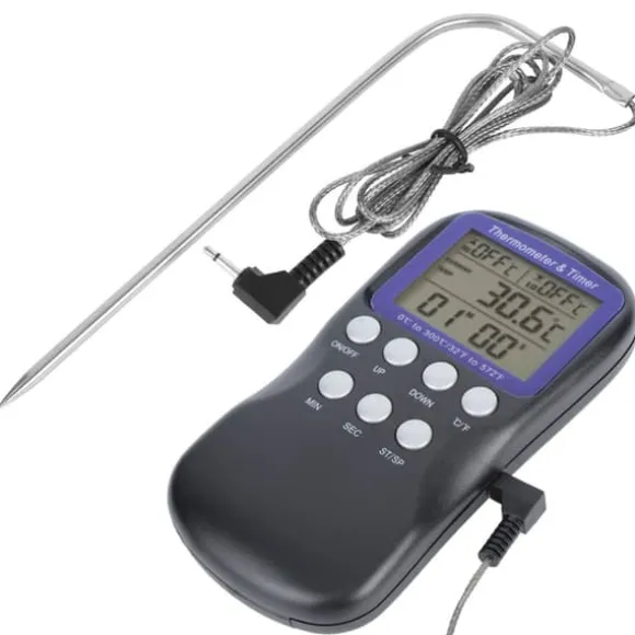 Välkommen till vår butik! Denna matlagningstermometer är utrustad med en LCD-display som tydligt visar både larmtemperaturen och aktuella temperaturavläsningar. Den har en vikbar sonddesign för att skydda dina händer från brännskador under användning. Med ett temperaturmätningsområde på 0 ℃ till 300 ℉ (32 ℉ till 572 ℉) erbjuder den hög noggrannhet och möjliggör växling mellan ℃- och ℉-visning. Termometern har även klock- och nedräkningsfunktioner, vilket gör det enkelt att övervaka baktider och laga läckra måltider. Det är ett praktiskt köksverktyg lämpligt för grillning, stekning, bakning och användning i ugn. Produktinformation: Skicket är 100 % helt nytt. Produkttypen är en matlagningstermometer, tillverkad av ABS-material, perfekt för grillning och hemmabruk. Kräver 2 AAA-batterier (ingår ej). Vikten är cirka 141 g (5 oz), med produktmått på cirka 14,5 x 7 x 3 cm (5,7 x 2,8 x 1,2 tum). Mätområdet är 0 ℃ till 300 ℃ (32 ℉ till 572 ℉), med en mätnoggrannhet på ±1 ℃ till ±3 ℃ och en skärmupplösning på 1 ℃. Tidsdisplayen visar timmar, minuter och sekunder, med en nedräkningsfunktion på upp till 23 timmar, 59 minuter och 59 sekunder. Kabeln för den externa högtemperatursensorn är 1 m (3,3 fot) lång. Följ manualen för korrekt användning. Paketet innehåller: 1 x matlagningstermometer (batteri ingår ej), 1 x sond, 1 x spänne och 1 x manual. Nöjdhet: Våra kunder är vår högsta prioritet. Om du upptäcker några produktproblem efter att du mottagit varorna, såsom skador eller felaktig mängd varor, vänligen kontakta säljaren omedelbart. Vi gör vårt bästa för att ge dig tillfredsställande kundservice.