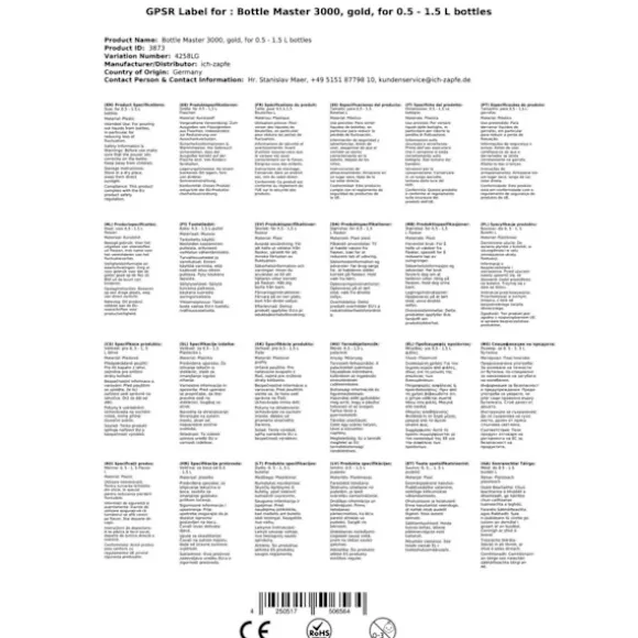 dosering Bottle Master 3000 för 0,5 – 1,5 liters flaskor * plast Gold * !! Number 1 vår scoop !! maximal vinst optimering genom att minimera taproom förlusten – speciellt formade locket mot föroreningar ! – lameller korkar säkerställa säker fastsättning på alla flaskor upp till 1,5 liter – exakta doserings i alla europeiska tjänstgör volymer av 2,0 – 5,0cl – snabb bild sekvens när upprepad fördelning varje sekund – Bil stoppfunktion sparar re virvlande flaskan – ingen fastklibbning av andar, som den flaska master 3000 utan rörliga delar som arbetar – funktion garanterat -10 ° C – säkra livsmedel – smaklös – droppkant förhindrar bildandet av droppar – modern design i svart, krom eller guld på begäran i speciella färger levereras Auschankmenge: Hotell i cl: 2,0; 2,1; 3,0; 3,5; 4,0; 5.0 och sälja i ml: 20; 21; 30; 35; 40; 50 finns i färgerna:svart plast, plast krom, plast guld