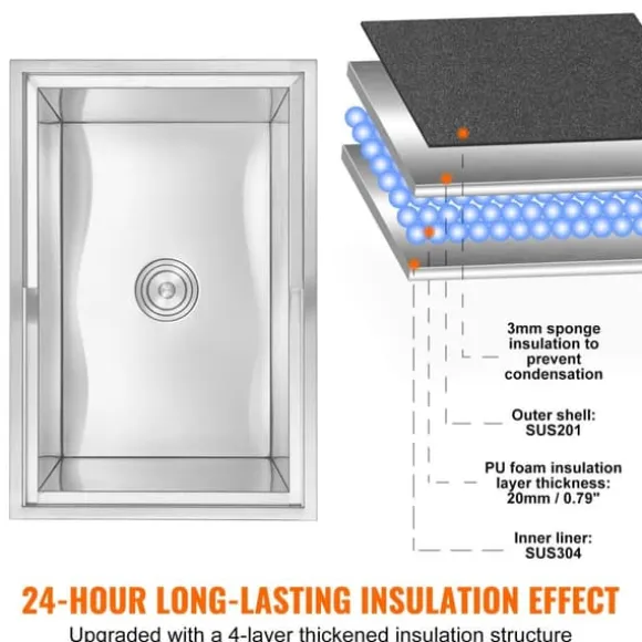 Den är konstruerad med rostfritt stål och ett 0,79″ (20 mm) PU-skumlager för exceptionell isolering utan behov av el eller energi. Håller drycker och is kalla i över 24 timmar.