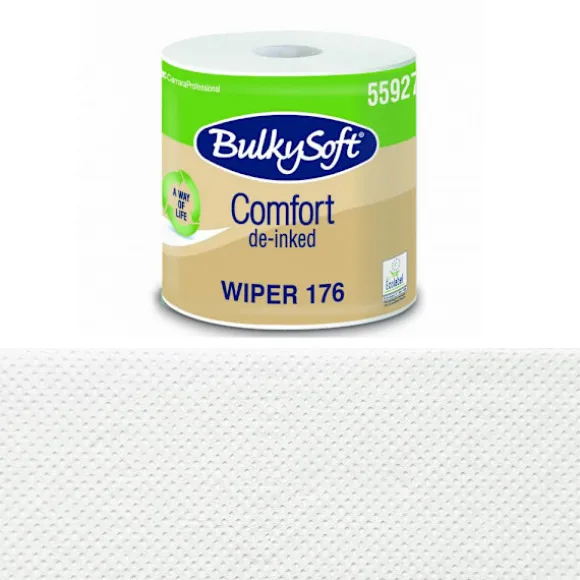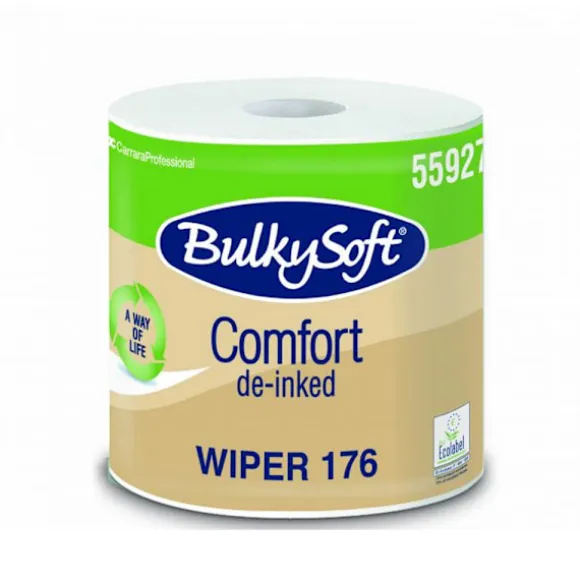 Bulkysoft Comfort avsvärtade pappersavtorkningsdukar på 176 m rulle är en ekonomisk tvålagersavtorkningsduk från Bulkysoft Comfort. Bulkysoft COMFORT avsvärtade pappersavtorkningsdukar består av två lager ren cellulosa med tillsats av utvalda återvunna cellulosafibrer.