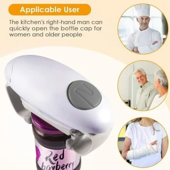 L’ouvre-bocal elektrisk One Touch gör det enkelt att öppna burkar. Du behöver bara trycka på en knapp för att aktivera den, och den skär av locken i 360°. Perfekt för äldre personer eller de som har svårt att greppa.