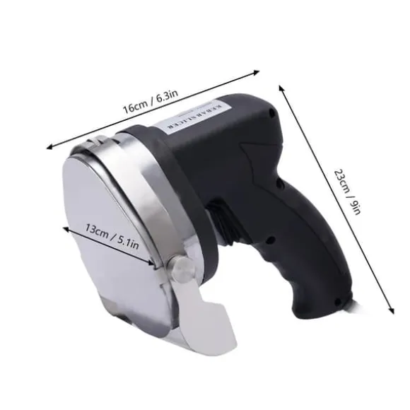 Kompakt elektrisk kebabskärare för jämna, precisa skivorHandhållen kebabskärare med supervass rund klinga (Ø 10 cm) i rostfritt stål, justerbar skärtjocklek 1–8 mm och tyst 80 W-motor. Perfekt för lamm, kyckling eller nötkött – snabb, ren och bekväm skärning med ergonomiskt grepp och avtagbar, diskmaskinssäker klinga.