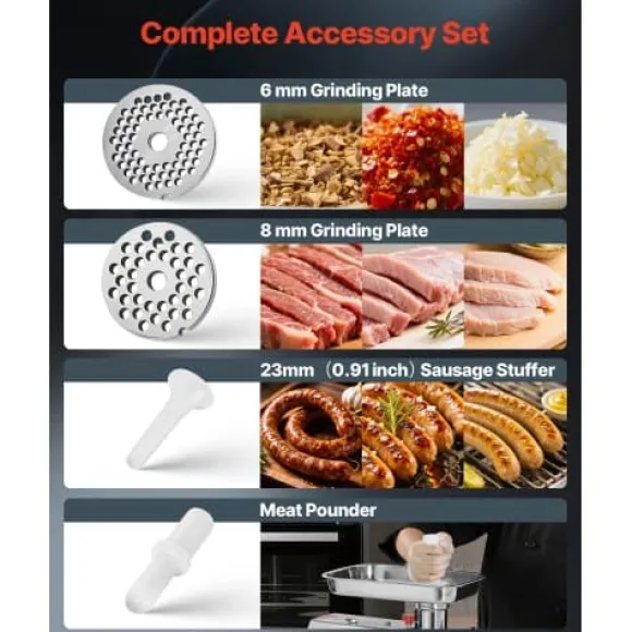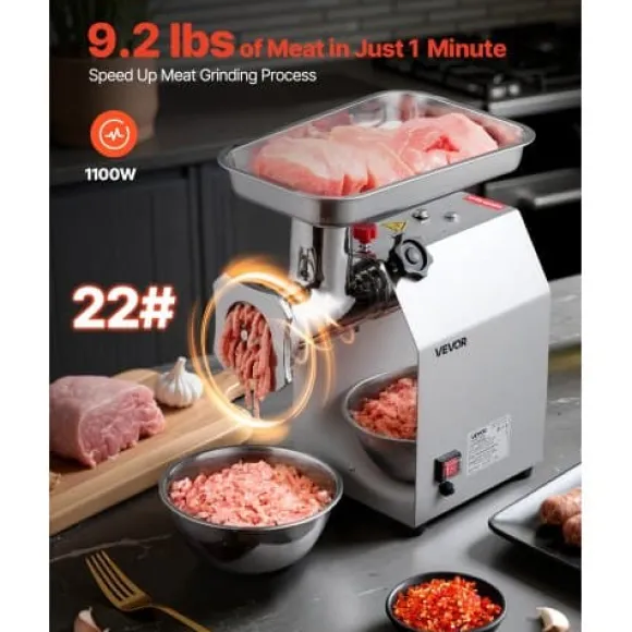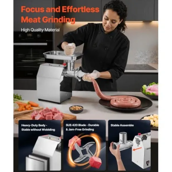 Denna kommersiella elektriska köttkvarn är utformad för högpresterande köttbearbetning i kök, restauranger och livsmedelsverksamheter. Med sin robusta konstruktion och mångsidiga tillbehör maler den enkelt olika typer av kött och kan även användas som korvtillverkare. De löstagbara delarna säkerställer enkel rengöring och underhåll efter intensiv användning.