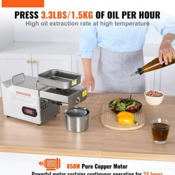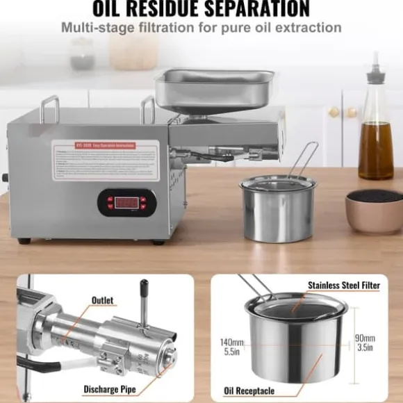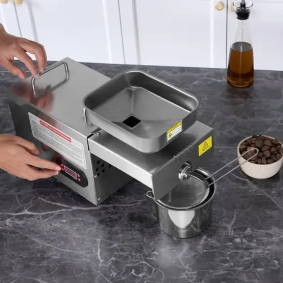 Den elektriska oljepressen är utrustad med en kraftfull 850 W motor av ren koppar, som kan pressa 1,5 kg (3,3 lbs) olja per timme i kontinuerlig drift, dygnet runt. Vår oljeextraktionsmaskin använder en högtemperatur varmpressningsprincip för att förbättra oljeutvinningsgraden.