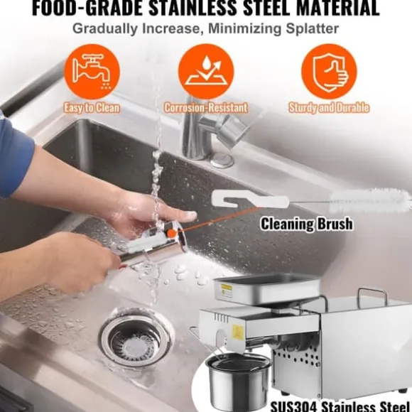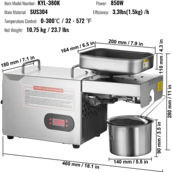 Vår oljepress är huvudsakligen tillverkad av livsmedelsklassat rostfritt stål SUS304, vilket säkerställer hållbarhet, rostbeständighet och enkel rengöring tack vare avtagbara tillbehör.