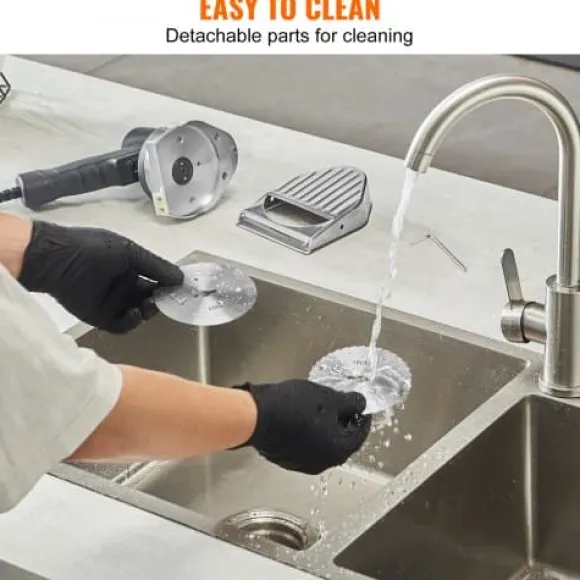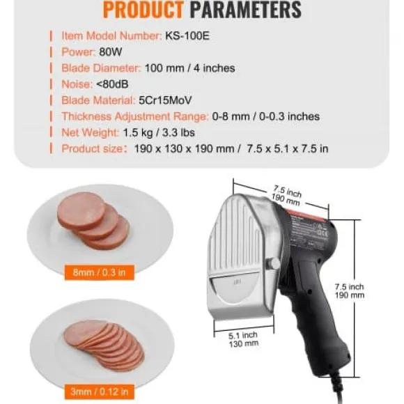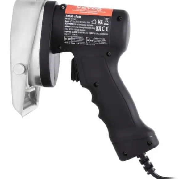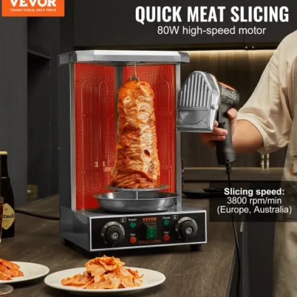 Denna elektriska shawarma-kniv är utformad för professionellt och kommersiellt bruk och gör det enkelt att skiva donerkebab, gyros och andra köttsorter effektivt. Med två utbytbara blad i rostfritt stål och ett justerbart tjockleksvred ger den precisa snitt och anpassar sig till olika texturer. Den lätta, ergonomiska designen och de löstagbara delarna säkerställer bekväm hantering och enkel rengöring.