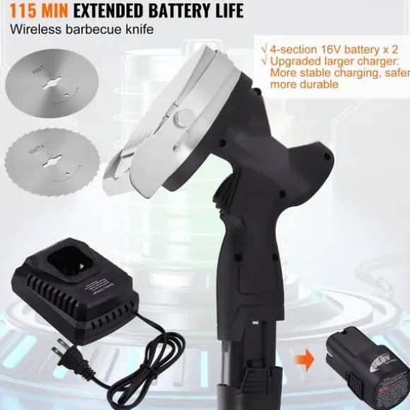 Längre batteritid: Den batteridrivna versionen av den turkiska kniven är utrustad med två batterier som vardera har fyra 16-volts celler, vilket ger en längre batteritid på 115 minuter och passar utmärkt för längre köttskärningsuppgifter. Den förbättrade, större laddaren säkerställer en stabilare, säkrare och mer hållbar laddning.