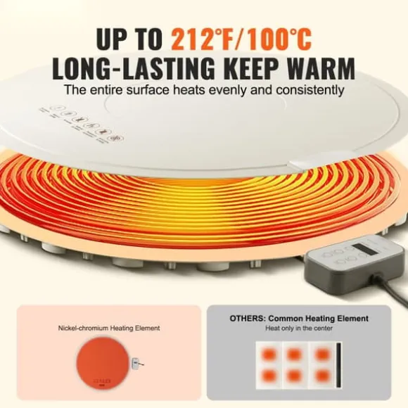 Håll maten varm länge med denna elektriska uppvärmningsbricka. Den rymliga ytan är utrustad med metallvärmetrådar för kontinuerlig värme i upp till 12 timmar, vilket ger dig varma måltider när som helst. Indikatorlampan visar när den är igång och släcks när rätt temperatur är nådd. Kom ihåg att lampan som slocknar inte betyder att produkten är ur funktion.