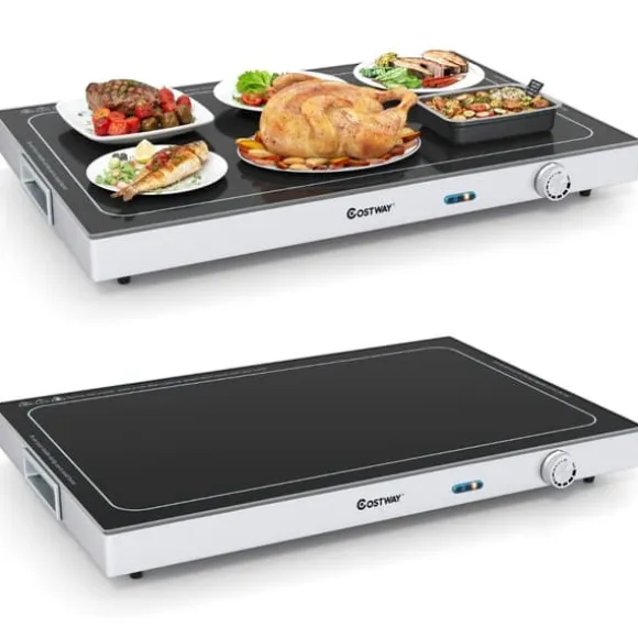 Elektrisk värmebricka med härdat glastopp, avsedd för att hålla flera rätter varma samtidigt, idealisk för bufféer, fester och evenemang. Utrustad med justerbar temperaturkontroll med inbyggd termostat, enkel att bära med integrerade handtag, samt säkerhetsförbättringar som halkfria silikonmattor och ventilationshål.