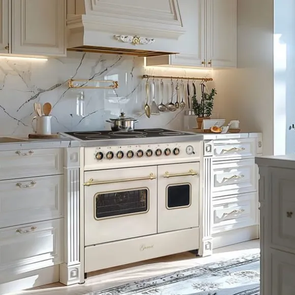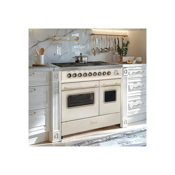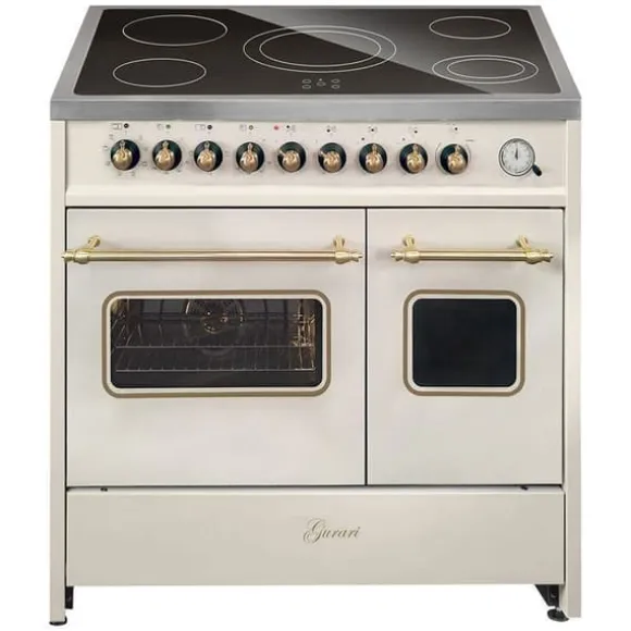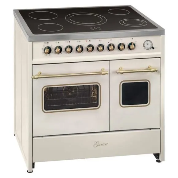 Gurari GCH E 912 DF Cr r Cuisinière elektrisk retro 90 cm med två ugnar i krämfärg, Gurari: tysk tillverkare/märke från en familjeägd hushållsapparatsproducent, Premiumkvalitet i europeisk standard, Mått på apparaten (H x B x D): 94 × 90 × 61,5 cm, Ytfinish: krämfärg, Glaskeramikhäll – 5 zoner med Hi-Light värmeelement, Större ugn: Multi 8 (över/under värme, varmluft, konvektion, fläktgrill, fläktugn, upptining, grill), Mindre ugn: Multi 3 (över/under värme, konvektion), Bruttovolym: stor ugn 59 L / liten ugn 30 L, Nettovolym EU: 55 L / 25 L, Push-Pull-dörr, Teleskopiska skenor (stor ugn) 1 nivå, valbara för förlängning, Ekologisk Easy clean emalj, Justerbara fötter, Elektromekanisk timer med STOP-funktion, Glaskeramikhäll med 5 Hi-Light zoner, Snabbuppvärmning, 1 x Ø 145 mm / 120 W (håll varm), 1 x Ø 145 mm / 1200 W, 1 x Ø 180 mm / 1800 W, 1 x Ø 110/180 mm / 750/1700 W (dubbel zon), 1 x Ø 275 mm / 1500/2400 W (dubbel zon), Håll varm-zon bakre höger (145 mm / 120 W), Främre vänster: 145 mm / 1200 W, Bakre vänster: 180 mm / 1800 W, Främre höger: dubbel zon 110/180 mm (750/1700 W), Center: stor dubbel zon 210/275 mm (1500/2400 W), Dubbelzoner markerade på knapparna (vrid förbi max för att aktivera), Valfritt tillbehör: gjutjärnsgallerplåt kompatibel med alla zoner, Teknisk information: Mått på apparaten: 94 × 90 × 61,5 cm, Förpackning: 105 × 95 × 69 cm, Energikälla: elektrisk, 3 faser, Säkring: 16 A, Spänning: 380–415 V 3N, Frekvens: 50/60 Hz, Uppfyller säkerhetsstandarder: ja, Nettovikt: 79 kg, Leverans till lastbilens fot.