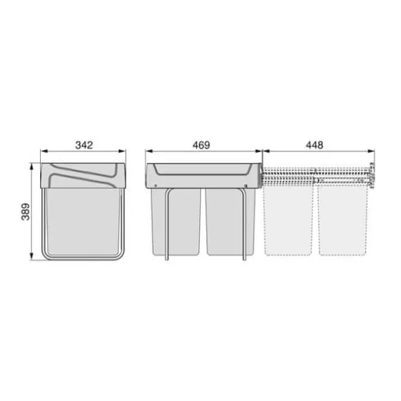 Emuca återvinningskärl för kök med nedre montering och manuell tömning, 2×20 liter, grått plastmaterial.