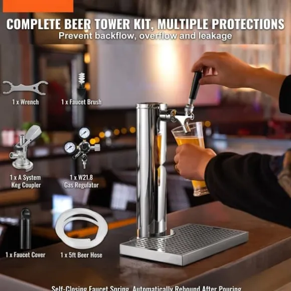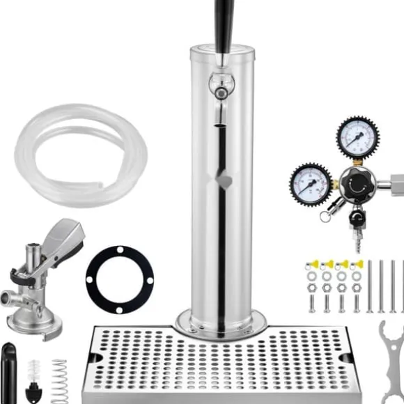Tillverkad av premium 304 rostfritt stål, öltornet med en kran erbjuder exceptionell hållbarhet och tillförlitlighet, perfekt för både kommersiella och hemmabrukare. Denna kegerator tornsats innehåller en 5 fot ölslang, 1 A-system fatkoppling, 1 dubbel gauge W21.8 regulator, 1 droppbricka för öl, 1 krannyckel, 1 rengöringsborste, 1 krankåpa och en uppsättning monteringstillbehör.
