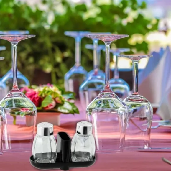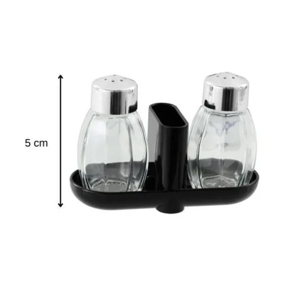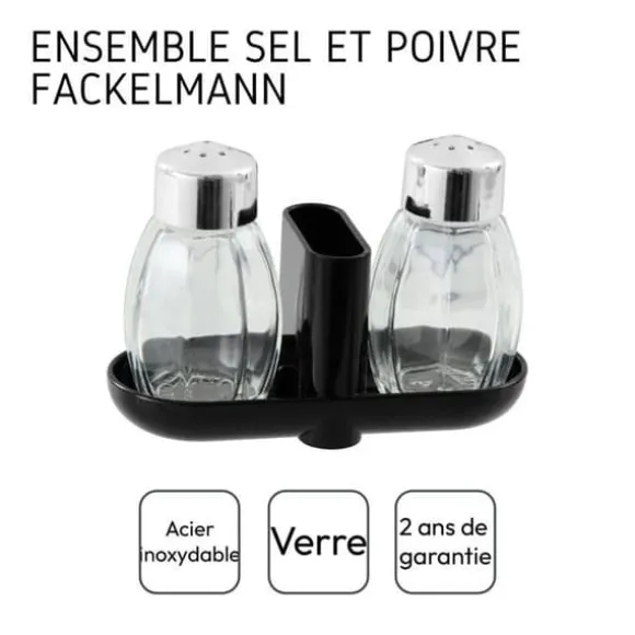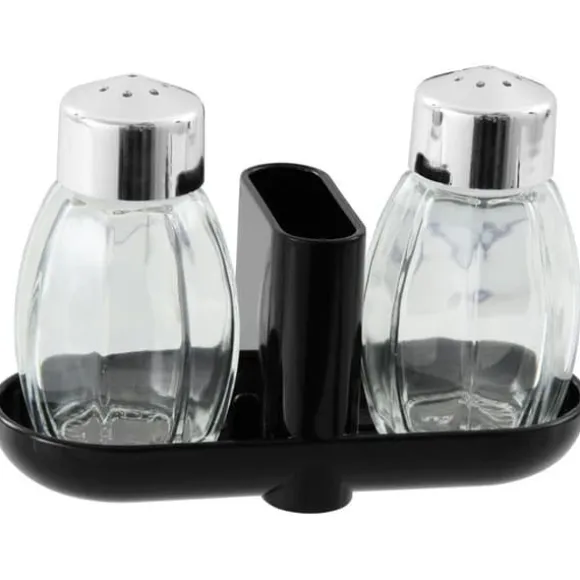 BESKRIVNING: Set med bordssalt- och pepparkar. DET LILLA +: Detta salt- och pepparkar-set innehåller även ett fack för att placera såser i påsar eller tandpetare. KOMPONENTER: Rostfritt stål, plast, glas. DIMENSIONER: 11,5 x 5 cm. INNEHÅLL: 1 saltkar + 1 pepparkar. Detta kökset innehåller en svart plastställning med ett saltkar och ett pepparkar. Mellan saltkar och pepparkar finns det ett utrymme där du kan placera tandpetare, såser i påsar eller annat. Detta set för salt och peppar är perfekt att ställa på ditt matbord så att alla kan krydda sin maträtt som de önskar. Fackelmann France är ett företag som specialiserar sig på distribution av köksredskap och bakverktyg samt kakformar och bakplåtar. Företaget strävar efter att underlätta matlagningen för alla med sina smarta redskap. Köksredskapen från Fackelmann France erbjuds till alla typer av kockar för enkel och daglig användning. Vispar, spatlar, slevar, skalare, skärbrädor och många fler finns tillgängliga för att förbereda läckra och alltid mer originella recept.