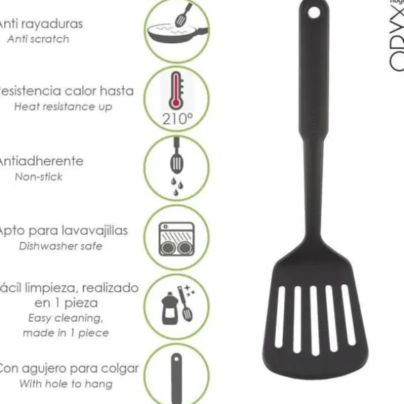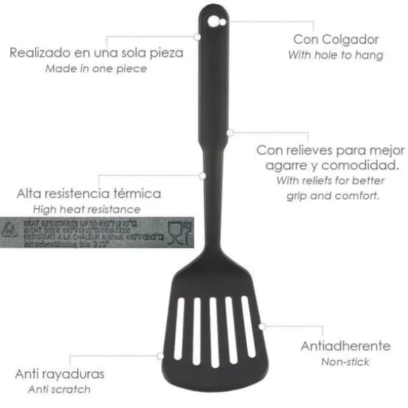 Espatula Rasera Köks Nylon Basic – Mått: 32,5 x 9 cm. – Tillverkad i nylon, ett lätt och hållbart material. – Hög termisk motståndskraft (upp till 240 C.) – Orsakar inga repor på grytor och stekpannor vid matlagning. – Kan diskas i diskmaskin. – Den är tillverkad i ett enda stycke, vilket ger ökad stabilitet samt underlättar rengöring. Espatula Rasera Köks Nylon Basic 32,5 x 9 cm.