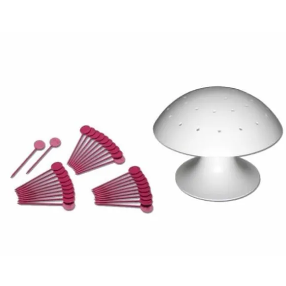 CHG-festsvampen, gjord av livsmedelsgodkänd plast, mäter 13,5 cm på höjden och 18 cm i diameter. Den levereras med 32 röda spett för en attraktiv presentation. Perfekt för att försköna dina bufféer under dina evenemang, den kombinerar praktisk och estetik.