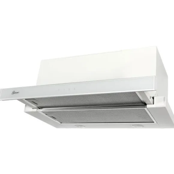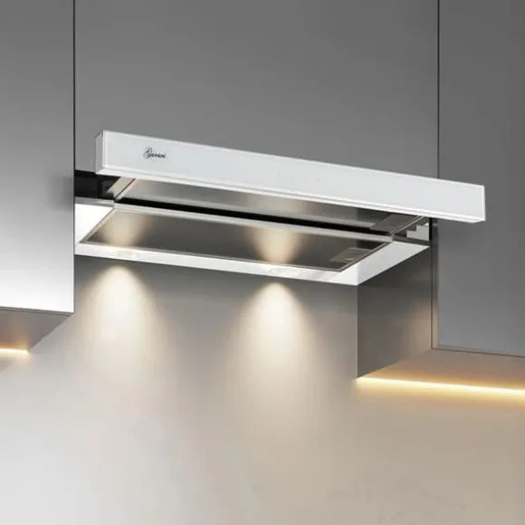 Ramen är i vit metall och fasaden i vitt glas, vilket gör att den kan integreras visuellt i nästan alla kök. Kontrollpanelen är integrerad i glaset. De olika funktionerna för köksfläkten (belysning och nivåinställningar) kan styras via ”Touch Control”-kontrollen.