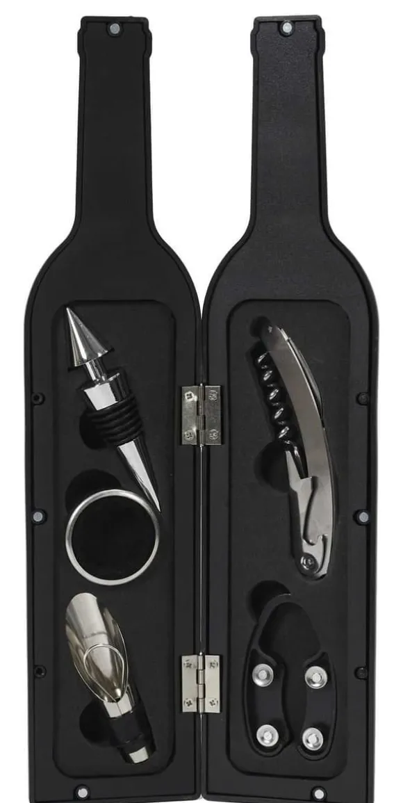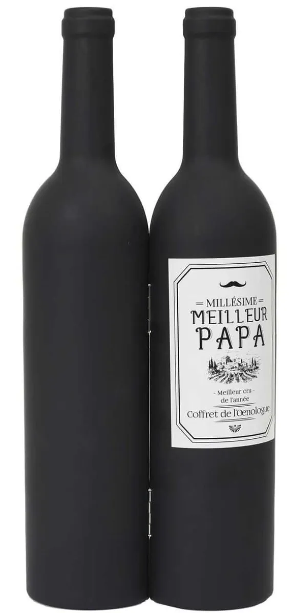 BOTTLE BOX är en unik och praktisk uppsättning vintillbehör, inrymd i en låda formad som en elegant flaska med inskriptionen ”Meilleur Papa.” Inuti hittar du fem väsentliga saker för varje vinälskare: en korkskruv i servitörstil, en droppfri propp, en hällpropp, en klassisk propp och en folieskärare. Det är den perfekta presenten för vinälskare – för en födelsedag, namnsdag eller som en tackpresent. Setet kombinerar funktionalitet med en genialisk design som enkelt passar in i en hemmabar eller kökshylla. Dess snygga design och kompakta storlek gör den också perfekt för att ta med på en picknick, middag eller resa. BOTTLE BOX-setet är en bra idé för en unik present.