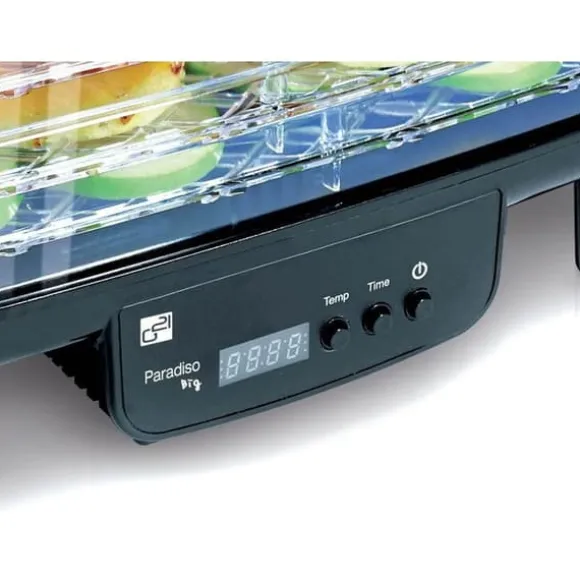 Frukt- och grönsakstork – effekt 550 W för torkning av 6 brickor, brickmått 43 cm × 29 cm (L × B), digital kontroll, automatisk avstängning, med timer, temperaturinställning från 40 till 70 °C, genomskinlig lock, med skärm, touchkontroll, vertikal luftflöde, plastbrickor, materialet i torken är plast, mått 21,5 × 43,5 × 29,5 cm (H × L × B)