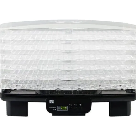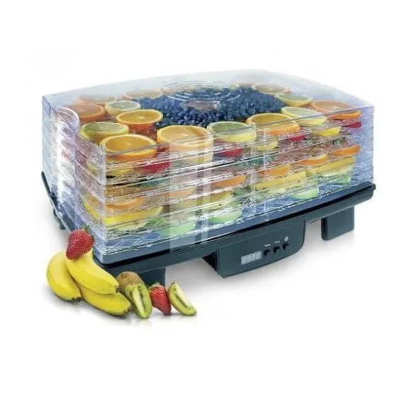 Frukt- och grönsakstork – effekt 550 W för torkning av 6 brickor, brickmått 43 cm × 29 cm (L × B), digital kontroll, automatisk avstängning, med timer, temperaturinställning från 40 till 70 °C, genomskinlig lock, med skärm, touchkontroll, vertikal luftflöde, plastbrickor, materialet i torken är plast, mått 21,5 × 43,5 × 29,5 cm (H × L × B)