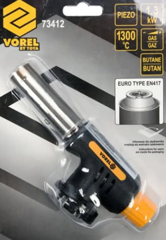 Tekniska data: Gasbrännare med PIEZO-tändning. Drivs av butangas från en extern cylinder – i enlighet med standarden EN417. TWIST-anslutning av cylinder till brännaren. Brännaren på 1,3 kW gör att du kan uppnå en temperatur på 1300 °C. Gasförbrukning 96 g/h. Brännaren har flameffektreglering. Butangas Smyckesarbeten, hantverk, modelltillverkning, gastronomi, Hemtillämpningar: Bränning av små metall- eller träytor Bränning av eldstäder, grillar, ugnar Varmböjning och formning Varmsvetsning och limning Lossning av fastsittande skruvar Uppvärmning och avfrostning Krympning av krympbara material Gastronomi ** Illustrativt foto.