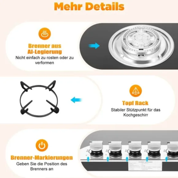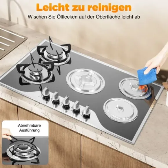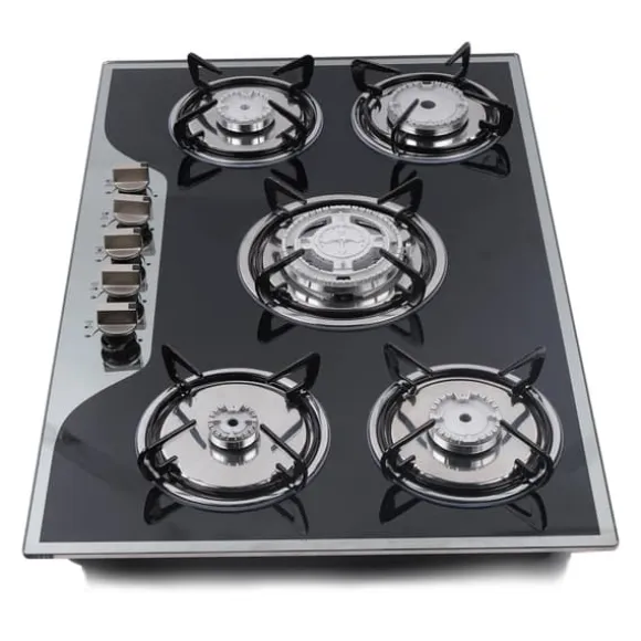 Kraftfull gashäll med 5 brännare för inbyggnad eller bänkmontageEn stilren häll i belagt glas med hållbara brännare i aluminiumlegering och emaljerade gjutjärnsgaller. Exakta vred och elektronisk tändning ger snabb start och smidig värmekontroll. Förinställd för naturgas (NG) och levereras med munstycken för LPG för flexibel användning.