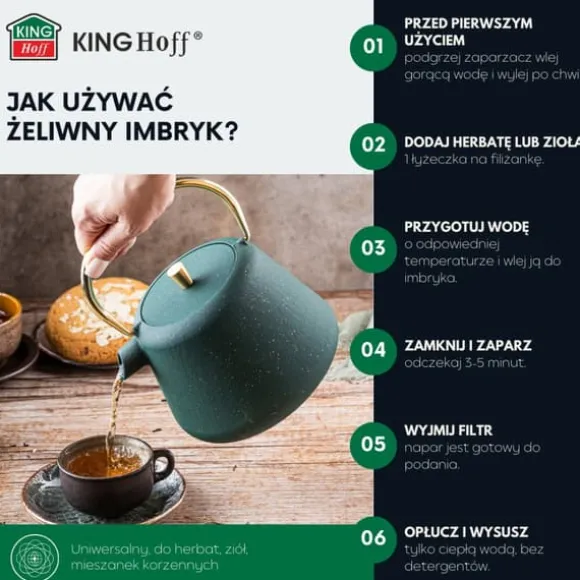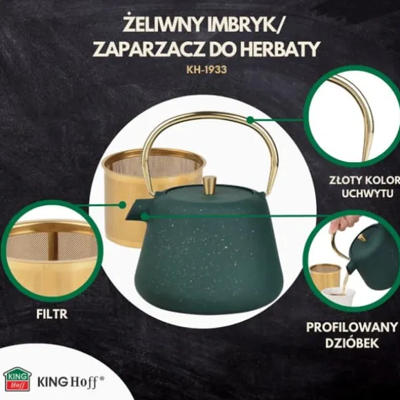 Gjutjärn tekanna, infuserFör te och örter, kapacitet 1000ml, KINGHOFF. Tillverkad av gjutjärn, emaljerad insida. Det gör att du kan njuta av doften av lösbladste och, när den placeras på ett bord, kommer den att fungera som en elegant dekoration. Detta företags produkter är synonyma med kvalitet och funktionalitet, riktade till älskare av moderna och vackra föremål. En traditionell metod för att brygga te i en attraktiv, orientalisk design. Infusionsenheten består av en kanna med ett bekvämt vikbart handtag och hällpip, samt ett stålfilter.