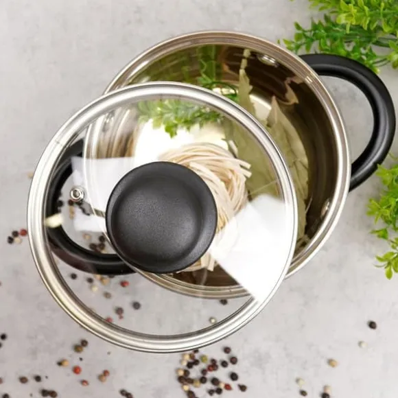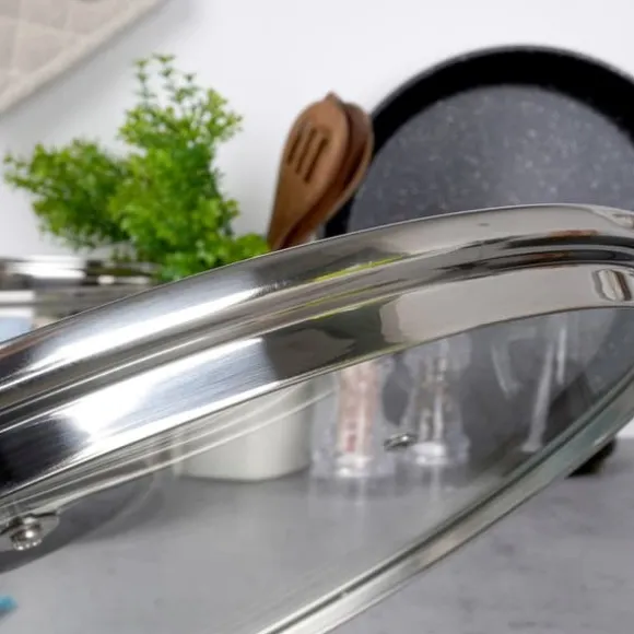 ✅ GLAS – Locket är tillverkat av värmebeständigt, transparent glas. Det har en silverfärgad kant i rostfritt stål och ett slitstarkt svart plasthandtag. Det transparenta locket gör att du kan kontrollera tillagningsprocessen utan att behöva lyfta det. Locket är motståndskraftigt mot höga temperaturer upp till +200°C.