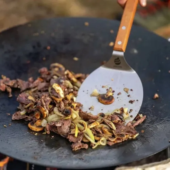 Stekspaden passar givetvis lika bra att vända övriga tillbehör på grillen och är strålande till stora wok etc. Handtaget är tillverkat i trä och lägger sig bra i handen när det är dags att vända burgaren, fram tills dess kan man enkelt hänga upp den med den medföljande öglan som händer på toppen av träskaftet.