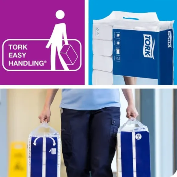 Pappershanddukarna är vikta i Z-vikning och kommer ut en handduk i taget – i kombination med Tork Xpress dispenser perfekt för toalettutrymmen med medelhög besöksfrekvens.