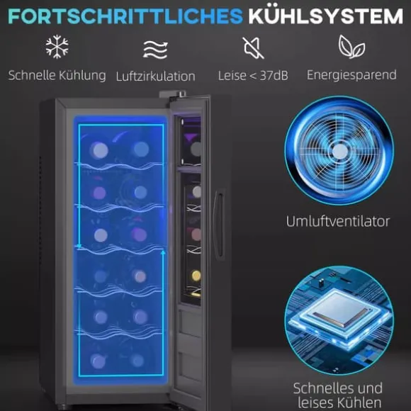 Håll dina drycker optimalt kylda med HOMCOM vinkylskåp. Njut av tyst och snabb dubbel termoelektrisk kylning med låg energiförbrukning i klass E. Perfekt för bänkskivor, passar denna kompakta vinkyl sömlöst in i alla hem eller hemmabar. Den UV-skyddande glasdörren på flaskkylaren säkerställer att alla drycker, från prosecco till öl, behåller sin utmärkta smak.