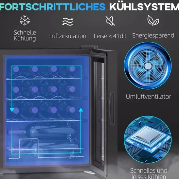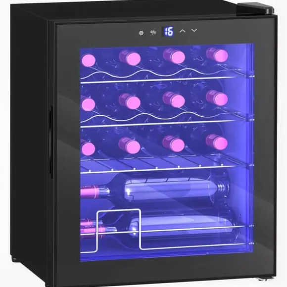 Säg adjö till röriga bänkskivor och felaktigt tempererad dryck: HOMCOM vinkylskåp kyler dina favoritröda, vita viner eller öl exakt och effektivt. Tack vare den UV-skyddande glasdörren skyddas dina flaskor från ljus, och den tysta driften säkerställer störningsfria kvällar. Trots sin kompakta storlek rymmer den upp till 16 flaskor och är utrustad med utdragbara hyllor, vilket gör den till ett elegant och användbart tillskott i köket, vardagsrummet eller hemmabaren.
