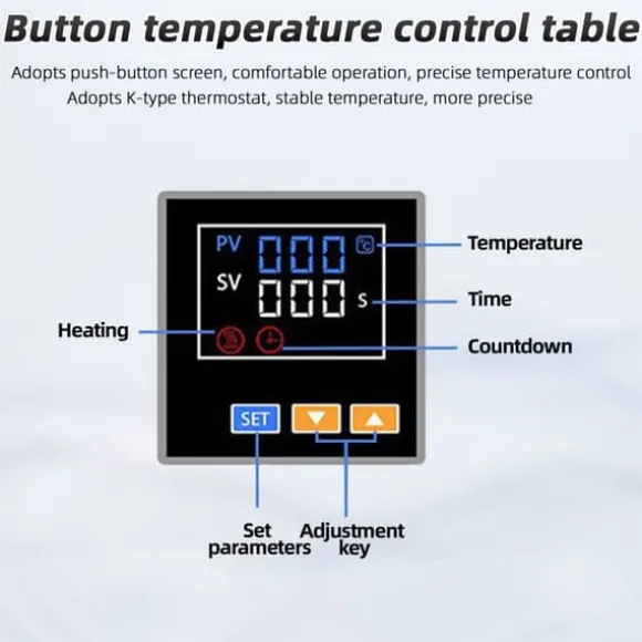 - stabil temperaturkontroll: njut av konsekvensen av dubbel-sidig uppvärmning med en pålitlig k-typ termostat för optimal prestanda.