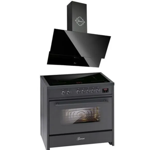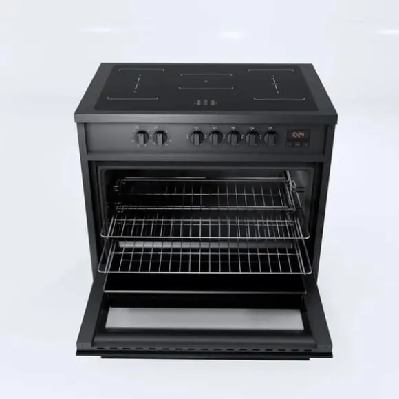 Gurari E 913 BL – induktionsspis 90 cm, elegant svart design med accenter i rostfritt stål, 5 zoner varav 2 Flex (40×20 cm) med booster, central zon Ø 200 mm (2300–3000 W), andra zoner: Ø 145 mm (1400–1850 W), Ø 160 mm (1400–2100 W), Ø 250 mm (2300–3000 W), multifunktionsugn XXL 121 L, 8 lägen: varmluft, grill, upptining, värme upp/ned, osv., easy clean emalj, teleskopiska skenor, LED-touch programmerare, push-pull låda, ugnslock med dubbelglas, inre belysning, tillbehör: galler + plåt, gjutjärn grillplatta tillgänglig som tillval, justerbara fötter (upp till 3 cm), installation utan fötter möjlig, europeisk kvalitet från det tyska märket Gurari, dimensioner: 94×90×61,5 cm, effekt: 11 kW, 3 faser, 400 V, vikt: 76 kg.